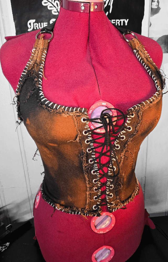 Frayed and distressed halterneck top in stretchy denim, with lots of handsewn stitches, and a laced up front.