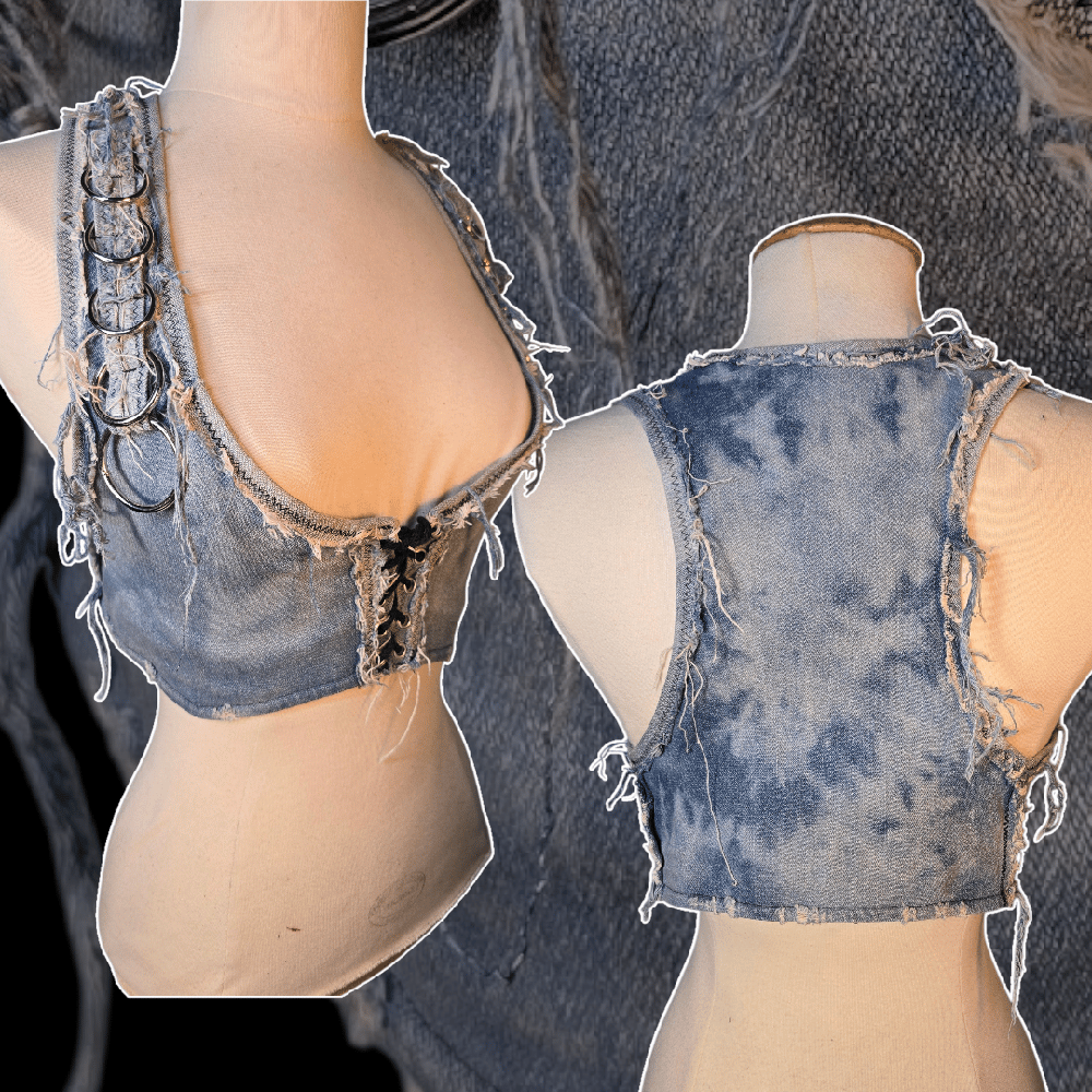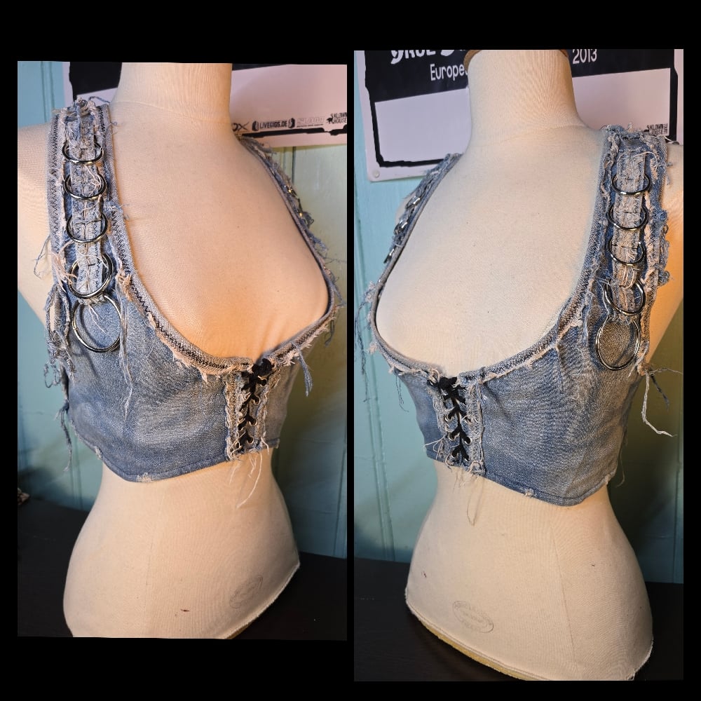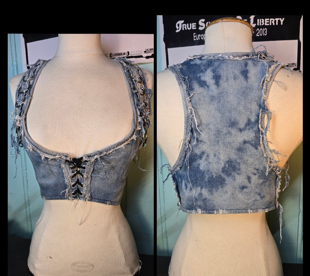 Frayed and bleached vest in high quality stretchy denim, with heavy metal rings and a laced up front!