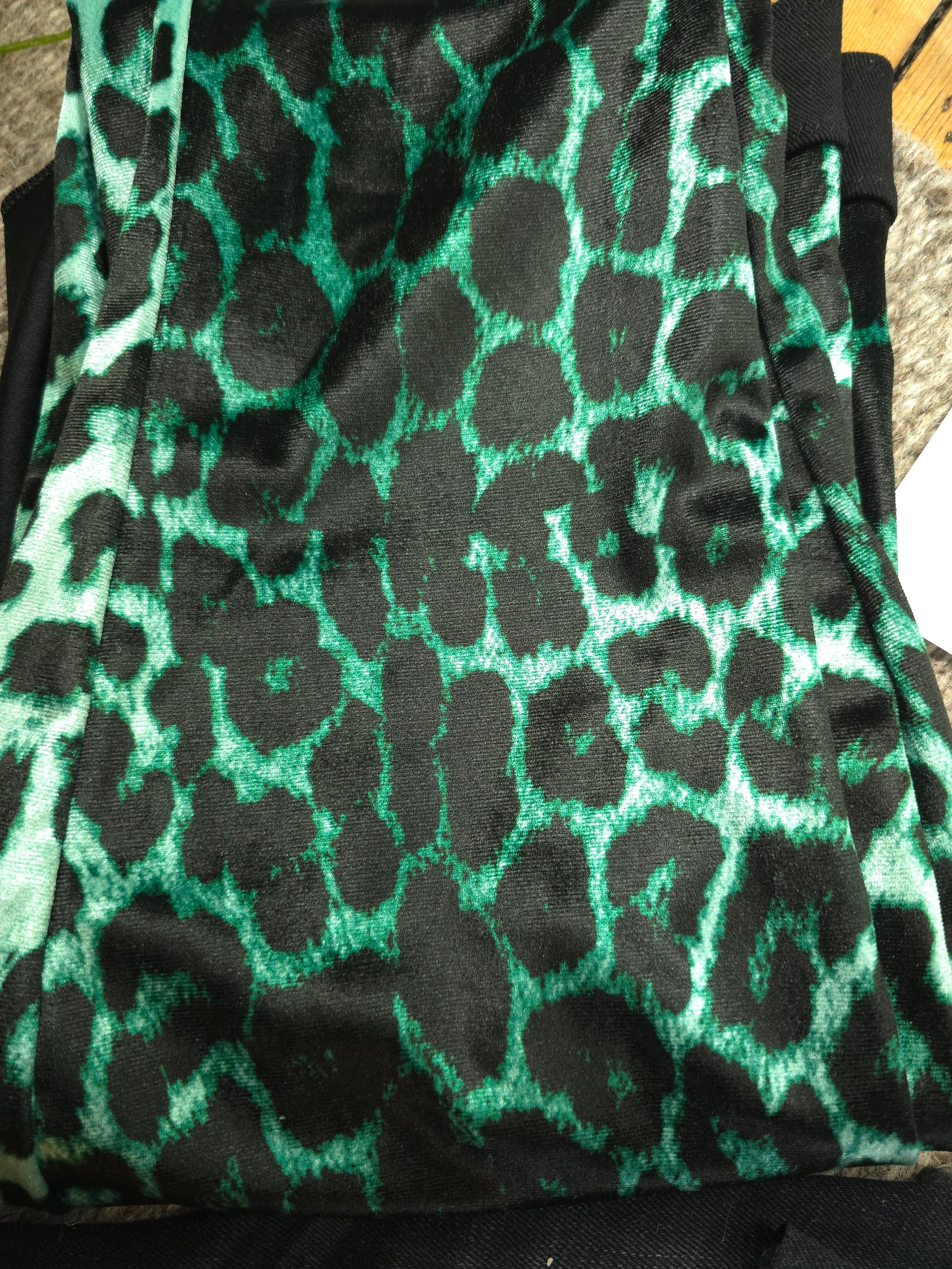 Made of green stretchy velvet leopardfabric, with 4 wide beltloops with heavy metal rings and a laced up front.