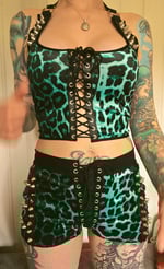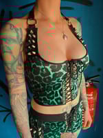 A top made of green velvet leopard fabric and high quality fauxleather, with an adjustable halterneck, studs and a laced up front.