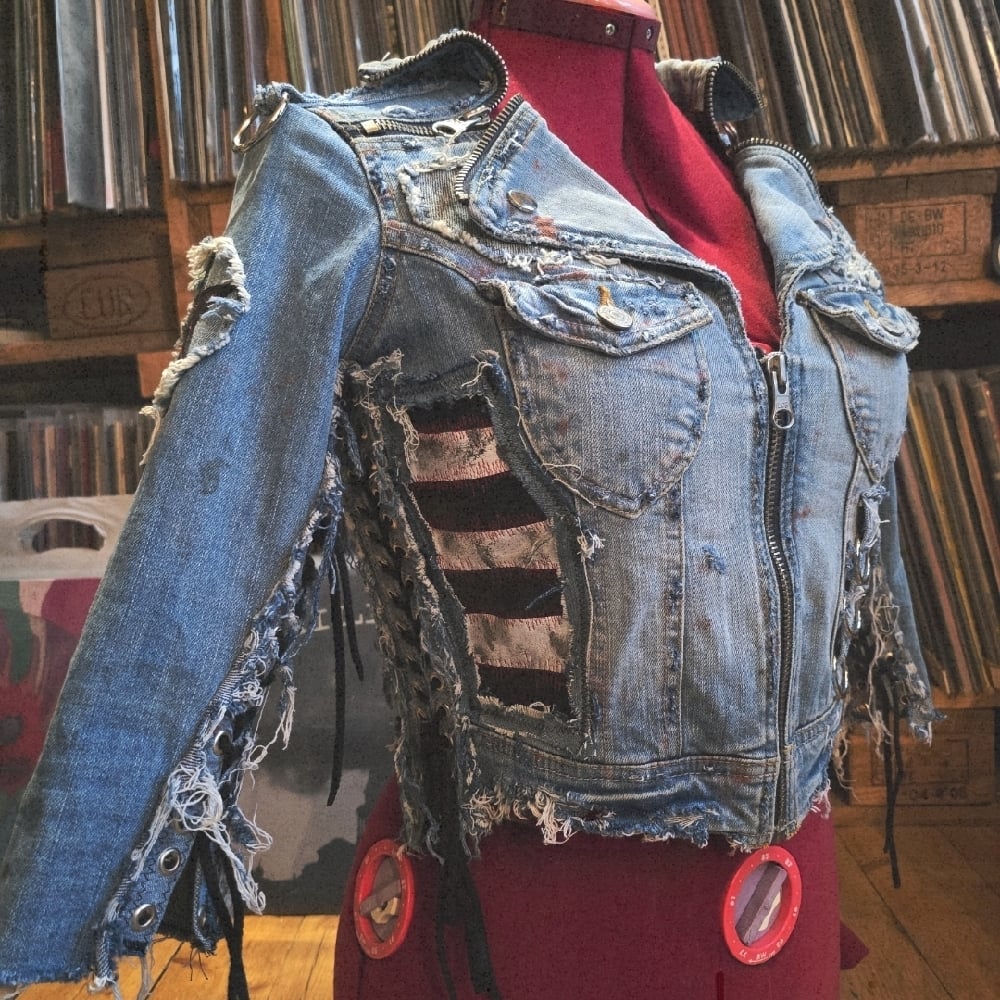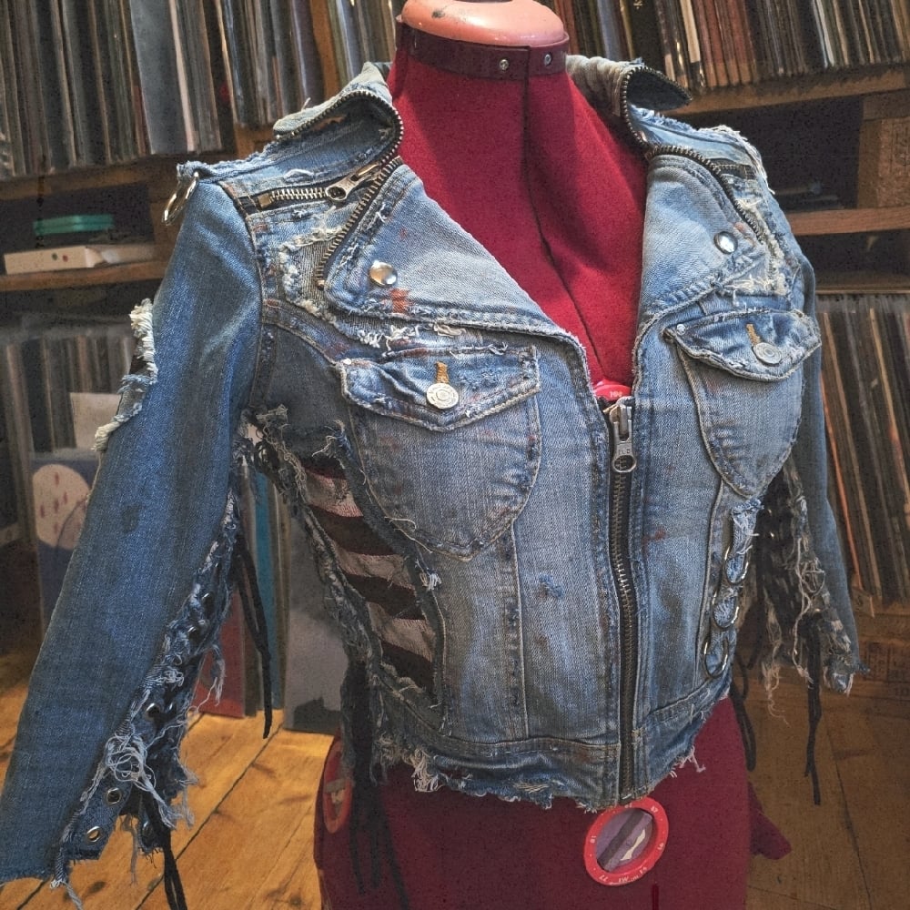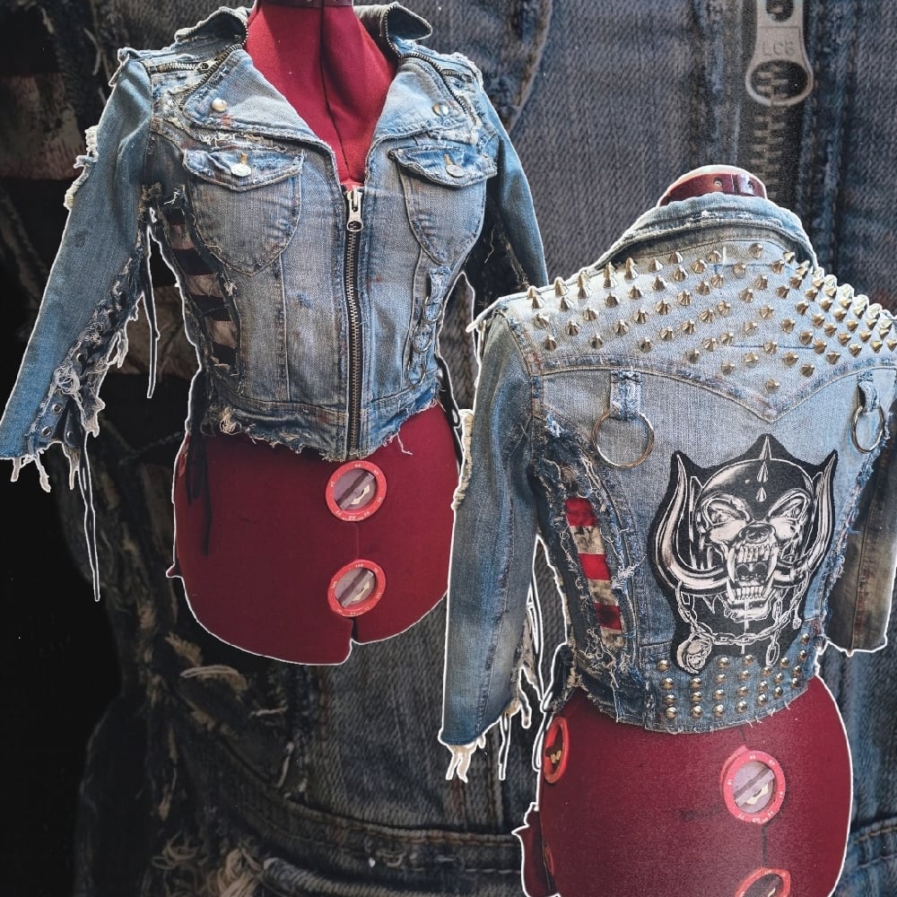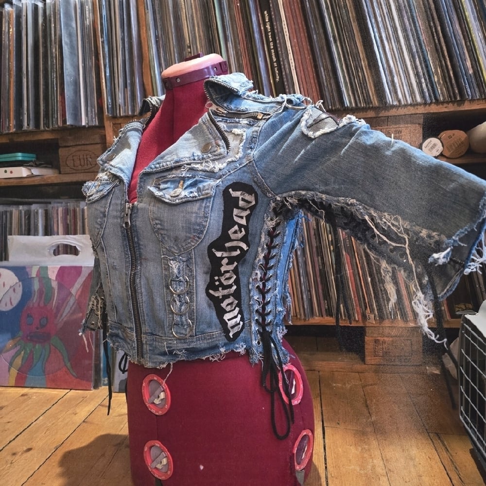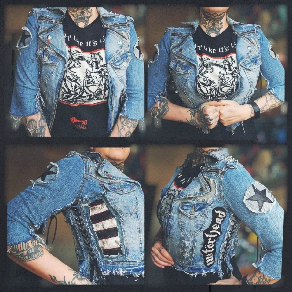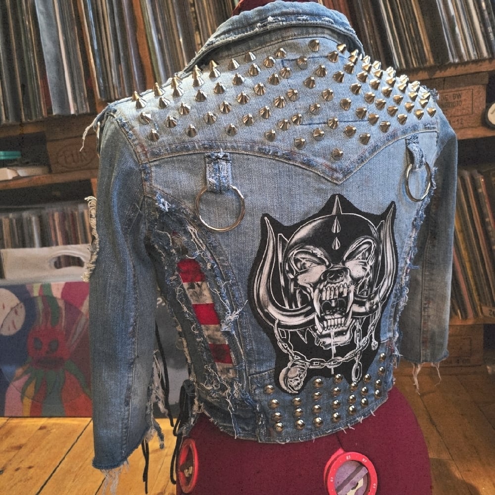 A very frayed and stained biker denim jacket with laced up arms and sides, heavy metal zipper details, star-details and black/white stripes in genuine black leather, lots of studs, heavy metal rings, frontpockets, snaggletooth on the back and a Motörhead patch + a zipper up front.
