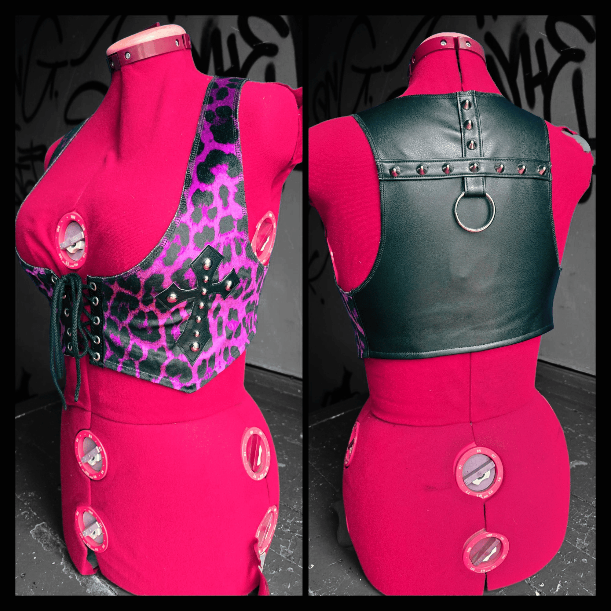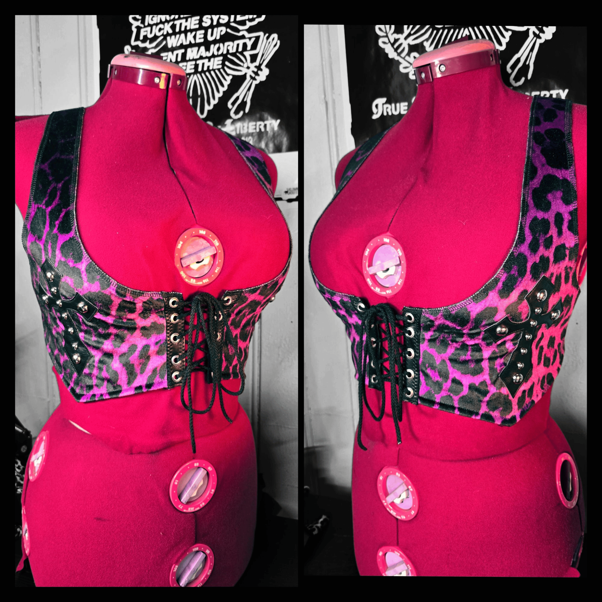 A underbust vest made of black high quality fauxleather and purple velvet leopard, with studded crosses, studs and a heavy metal ring on the back, and a laced up front.
